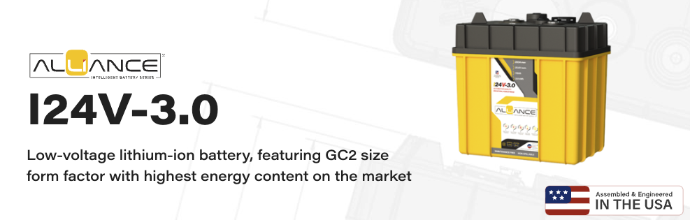 I24V-3.0 - The 24EV battery systems, part of the ALLIANCE Intelligent Battery Series™, are highly efficient and serve a variety of uses. Our I24V-3.0 comes in an industry-standard GC2 size form factor with the highest energy content and highest power handling capabilities on the market. It serves as the perfect drop-in retrofit of lead acid-batteries in motive power applications like utility vehicles, floor cleaning machines, pallet jacks and mobile elevated work platforms (MEWP).